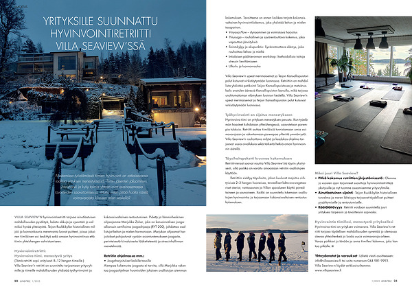Hyvinvointia tiimillesi , menestystä yrityksellesi Hyvinvoiva tiimi on yrityksen voimavara . Villa Seaview ’ n retriitti tarjoaa täydellisen mahdollisuuden syventää jo olemassa olevaa yhteishenkeä ja luoda uusia voimavaroja arkeen . Varaa paikkasi jo tänään ja anna tiimillesi kokemus , joka kantaa pitkälle . n