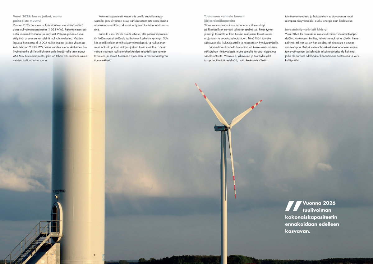 Samalla vuosi 2025 osoitti selvästi, että pelkkä kapasiteetin lisääminen ei enää ole tuulivoiman keskeisin kysymys. Sähkön markkinahinnat vaihtelivat voimakkaasti, ja tuulivoiman suuri tuotanto painoi hintoja ajoittain hyvin mataliksi. Tämä vaikutti suoraan tuulivoimahankkeiden taloudelliseen kannattavuuteen ja korosti tuotannon ajoituksen ja markkinaintegraation merkitystä.
