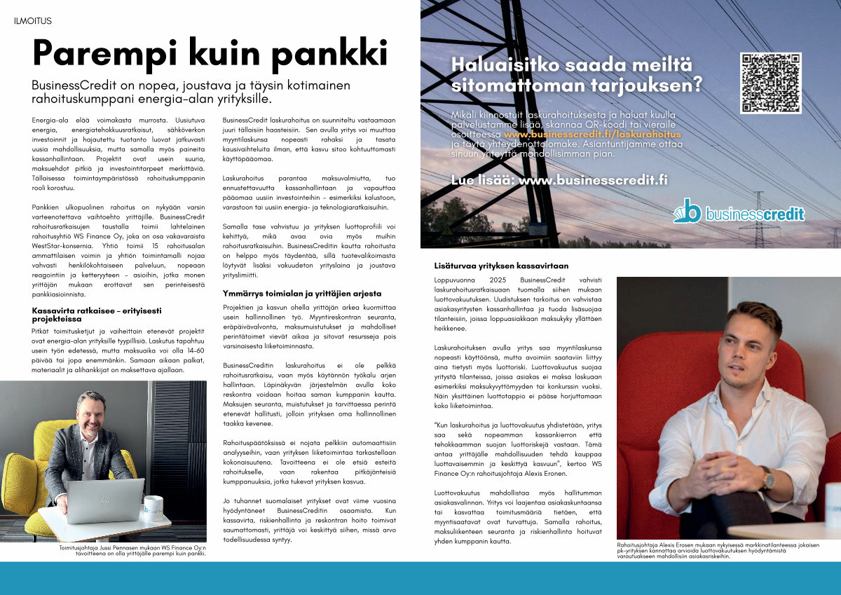 “ Kun laskurahoitus ja luottovakuutus yhdistetään, yritys saa sekä nopeamman kassankierron että tehokkaamman suojan luottoriskejä vastaan. Tämä antaa yrittäjälle mahdollisuuden tehdä kauppaa luottavaisemmin ja keskittyä kasvuun”, kertoo WS Finance Oy: n rahoitusjohtaja Alexis Eronen.